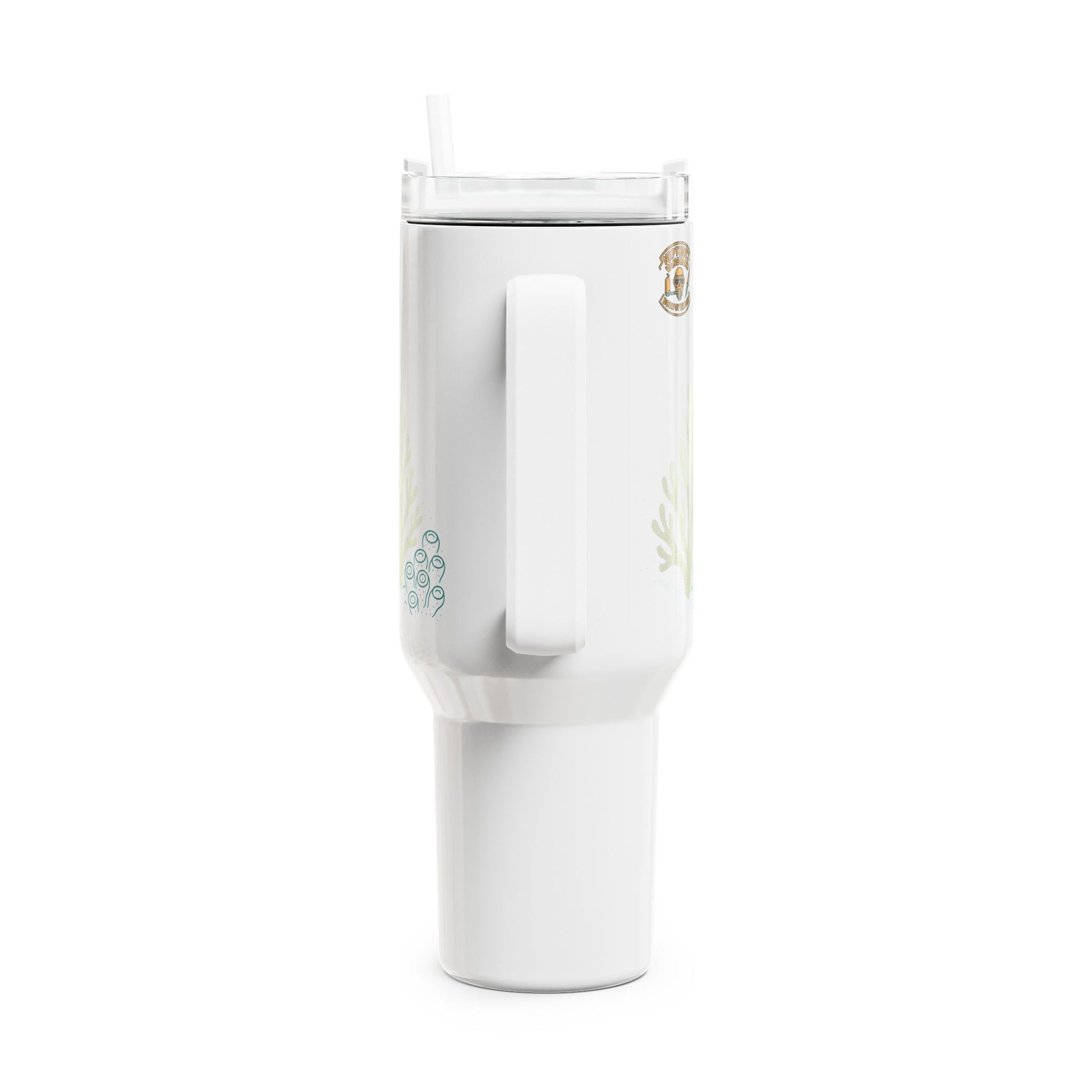 This 40oz tumbler brings a playful, ocean adventure vibe to every sip. A smiling scuba turtle illustration wraps the glossy white body, paired with subtle coral accents and a small emblem for an authentic dive team feel. The tall, slim profile fits car cup holders and the secure rubber sealed push down lid with straw keeps drinks contained during commutes, beach days, or long boat rides. Double wall vacuum insulation holds cold or hot beverages for hours, while the bright ORCA coated print keeps colors vivid through daily use.
